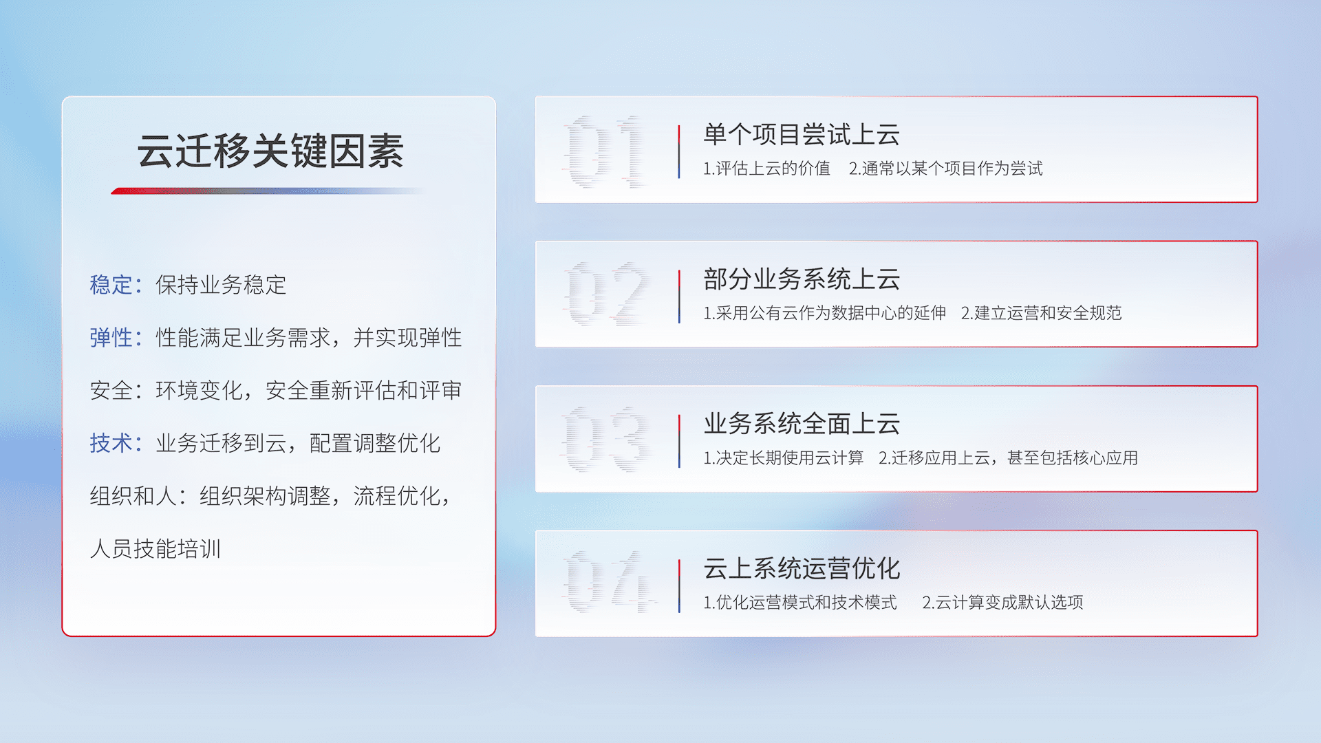 结合实际业务,,,,从规划设计、、、、云平台选型、、、、云原生改造、、、、数据迁移、、、、集成交付,,,迁移全过程为客户识别最佳上云路径,,,,做好风险识别管理,,,,设计网络架构、、、、身份权限、、安全审计合规、、操作审计、、日志审计、、监控告警策略、、、多站点容灾设计等,,,,对云上基础设施进行整体规划,,,,提升IT治理水平,,,,以满足弹性、、、、高可用、、、、高性能的需求。。。。